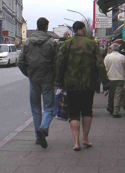 Der Mann ist ausstaffiert mit Piratenkopftuch und Tarnjacke. Ob sich Schuhe in seiner Plastiktasche befinden, kann ich nicht sagen; das, was die Tasche quaderförmig ausbeult, sieht aber nicht so aus. Mit seinem Kumpel unterhält er sich ganz normal, als sei es keineswegs verhaltensauffällig, kurz vor Weihnachten barfuß durch Ottensen zu laufen.