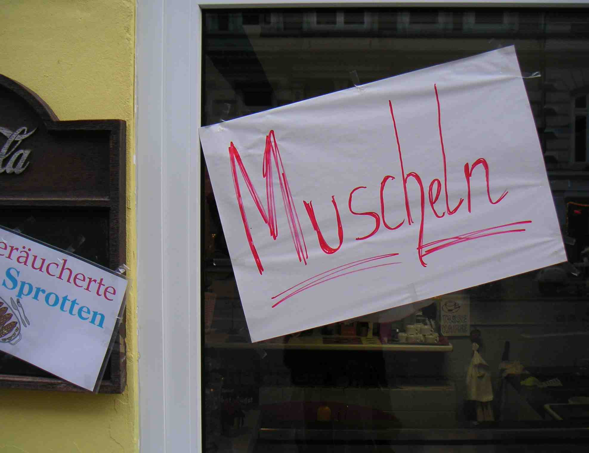Genauer gesagt in der Hein-Hoyer-Straße, wo unser kleiner Kiezfischladen zeigt, wie man Botschaften auf ihren Kern verdichtet: „Muscheln“.